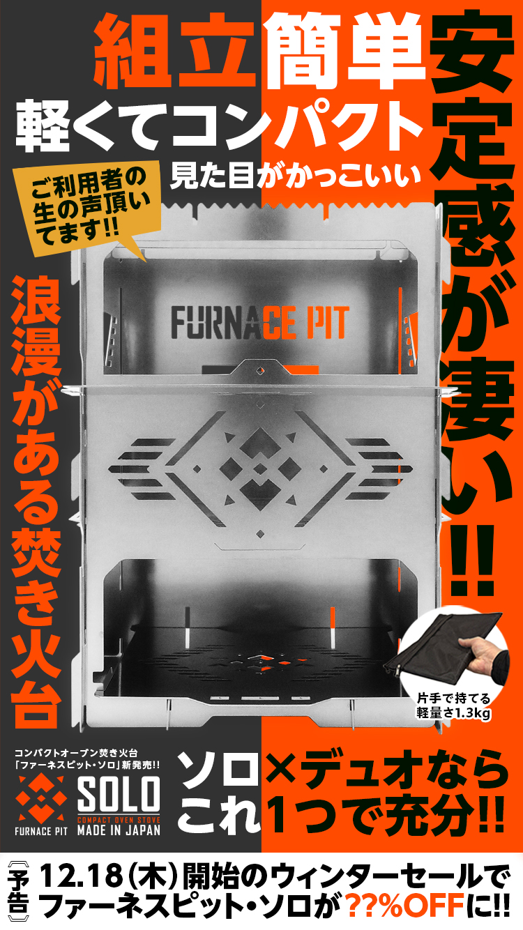 新発売のオーブン焚き火台「ファーネスピット」の30%OFFセールは、システムの都合上2024年6月1日朝9時までの受付となりますので、改めてお知らせ致します。ご希望の方は期日までにご予約を宜しくお願い致します。