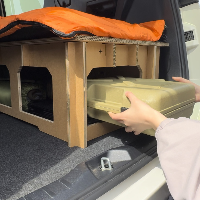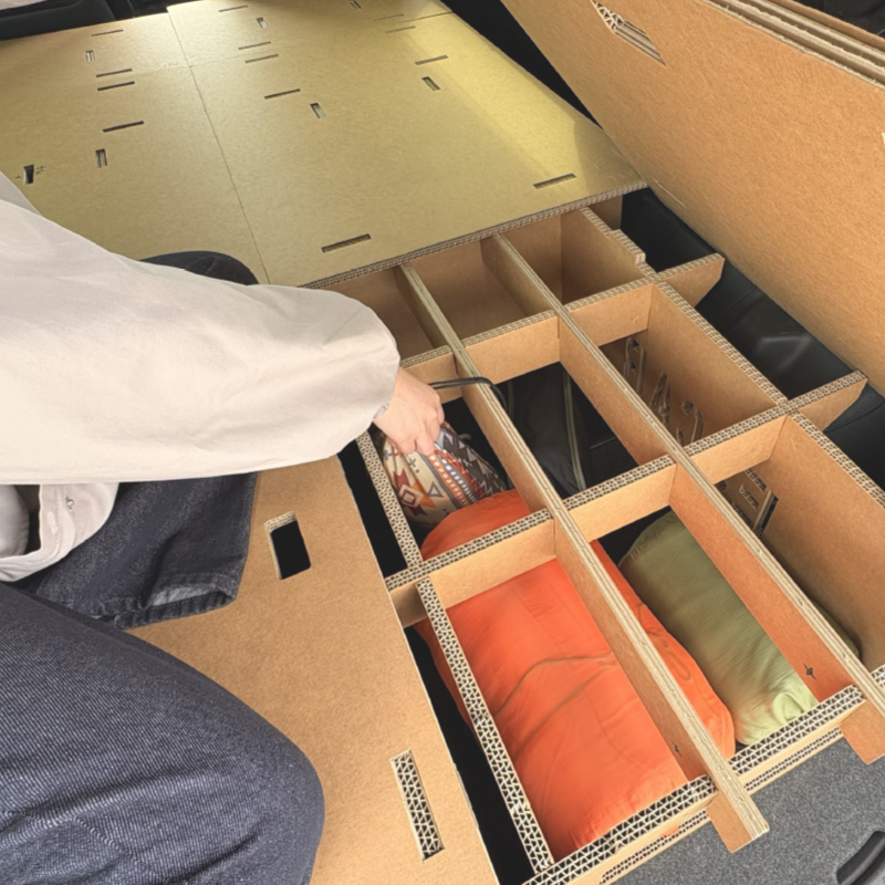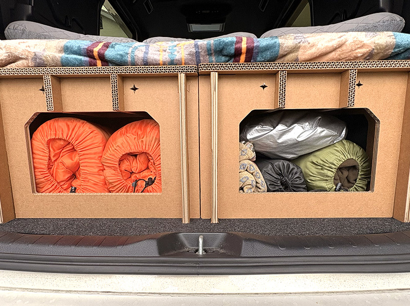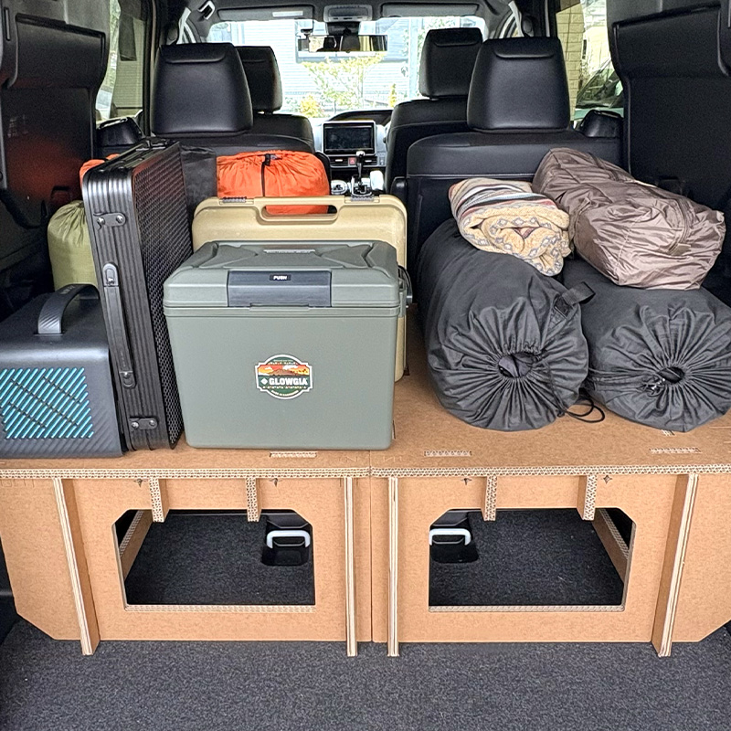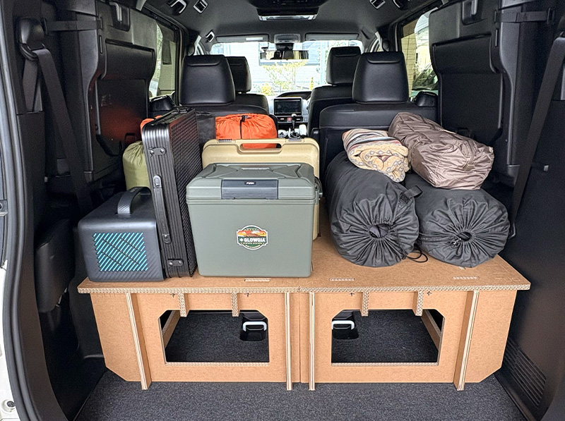 インフレーターマットや寝袋をお持ちの場合は、使わない時はエスカーベッドの下(高さ25cmの収納スペース)にコンパクトに収納できて、さらに車内を広く使えます。1セットならシングル、2セットならセミダブルサイズのマットが収まります。
